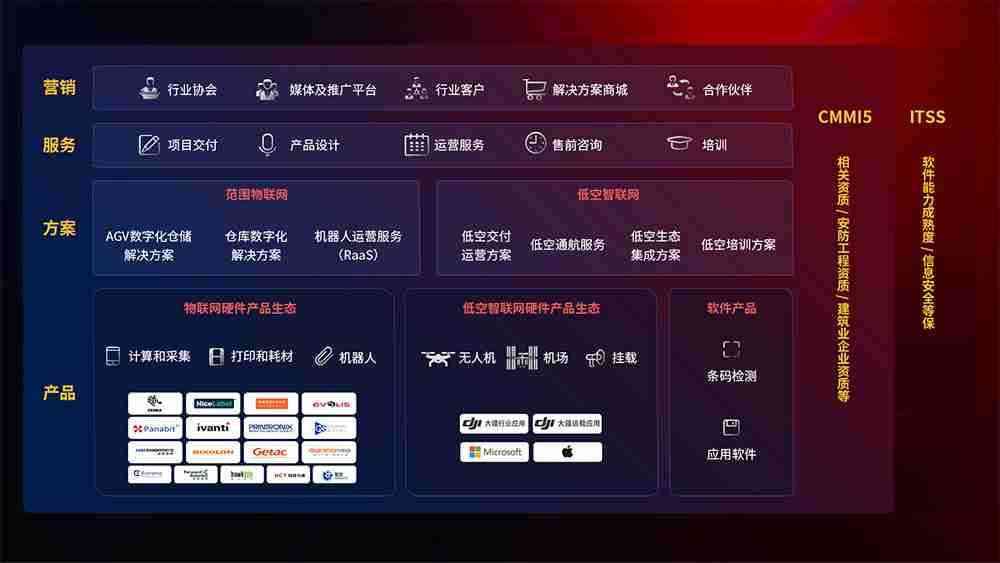 聚合国内外先进的物联网硬件产品品牌,,,聚焦数字化仓储、、、机器人运营、、、低空智联网等领域,,共同打造适合客户业务场景的解决方案并提供交付服务